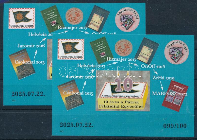 Leírás: 2025 10 éves a Pátria Filatéliai Egyesület emlékív pár azonos 099/100 sorszámmal