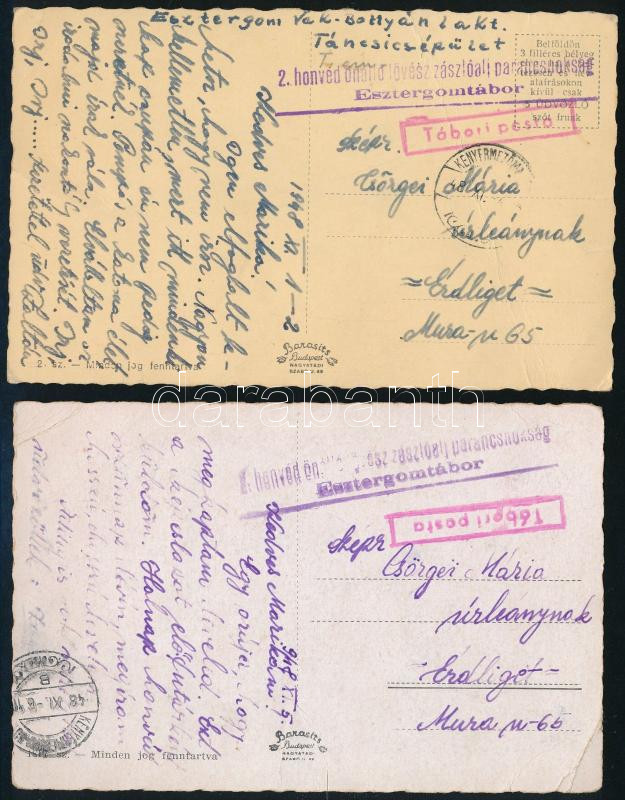 Leírás: 1948 2 db Esztergom képeslap "2. honvéd önálló lövész zászlóalj parancsnokság / Esztergomtábor", "KENYÉRMEZŐMAJOR"
