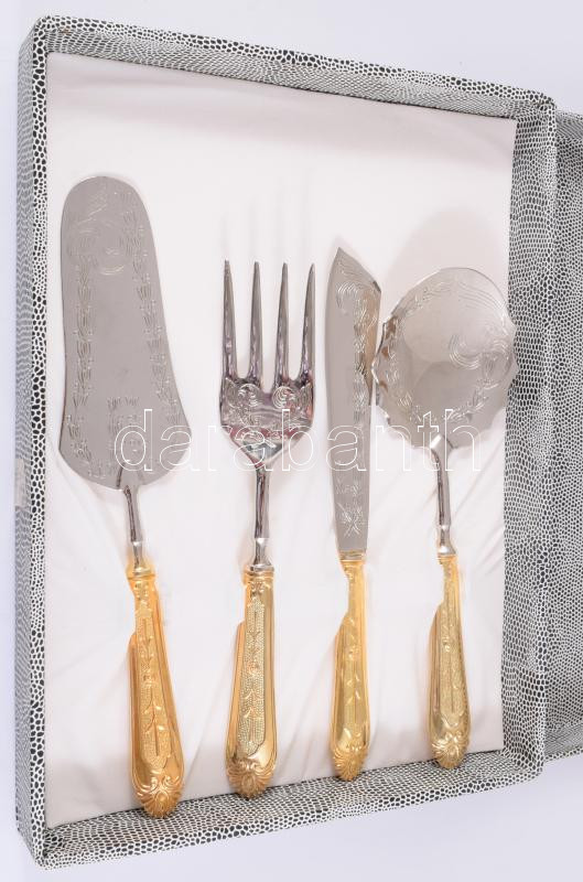 Leírás: 4 részes tortaszervírozó szett, díszdobozban, újszerű, h: 27 cm