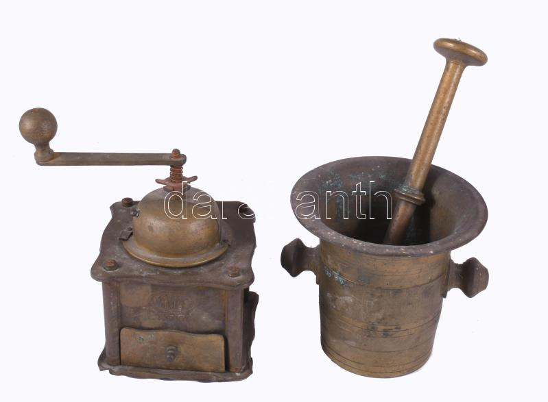 Leírás: Antik bronz mozsár törővel, m: 12 cm, törő h: 23 cm + Magus bronz kávédaráló kis hiánnyal, m: 18 cm