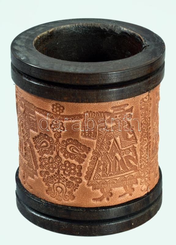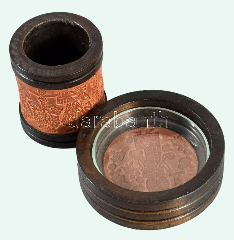 Leírás: Bőrműves berakással hamutartó és cigarettatartó, d: 9,5 cm