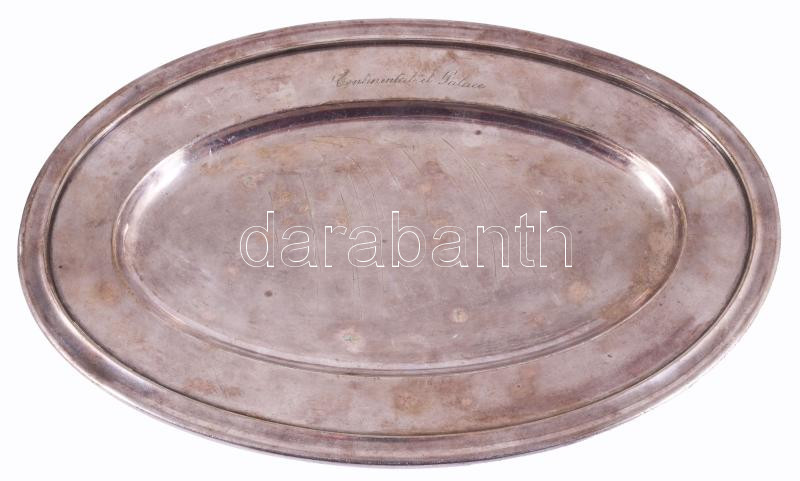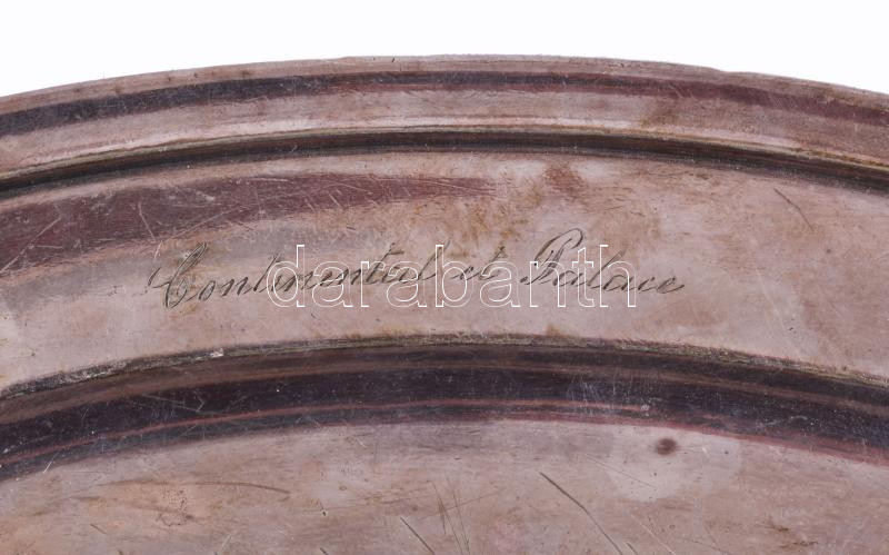 Leírás: Laderier ezüstözött alpakka tálca, "Continental et Palace" felirattal, kopással, 23x36 cm