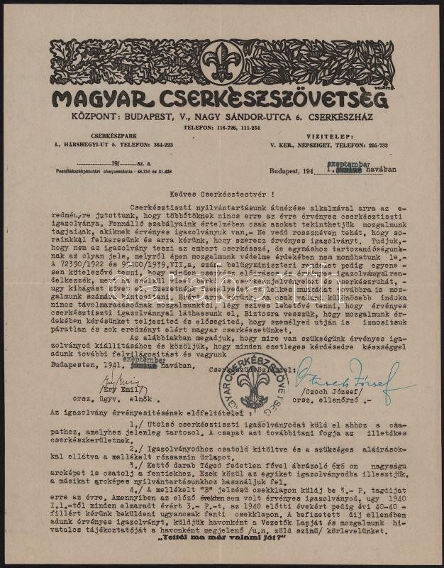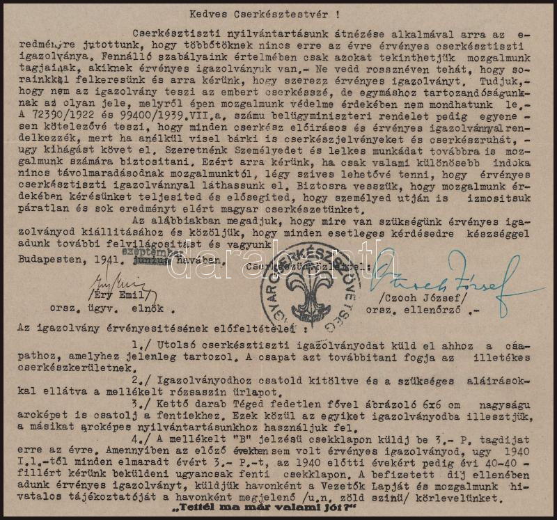 Leírás: 1941 A Magyar Cserkészszövetség gépelt levele Éry Emil orsz. ügyv. elnök és Czoch József orsz. ellenőrző sajátkezű aláírásával, pecséttel, amelyben felszólítja a cserkésztiszteket éves érvényes igazolvány kiváltására, hajtva, jó állapotban.