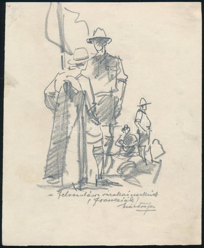 Leírás: Márton Ferenc (1884-1940): 1933 Gödöllői Jamboree - Francia cserkészek. Ceruza, papír, jelzett, / Scout Jamboree 1933. Gödöllő, French scouts. Pencil drawing 20x18 cm