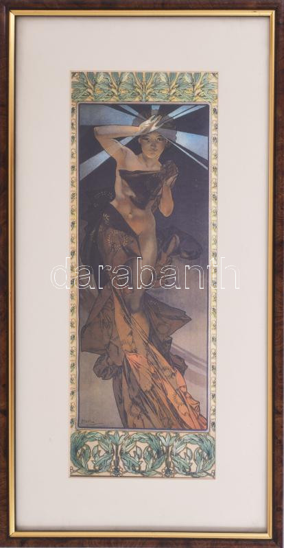 Leírás: Alphonse Mucha: Morning Star. Nyomat dekoratív üvegezett keretben, 36x13 cm, 48x25 cm