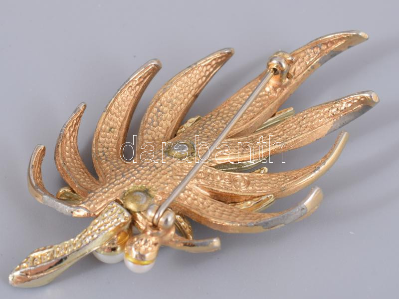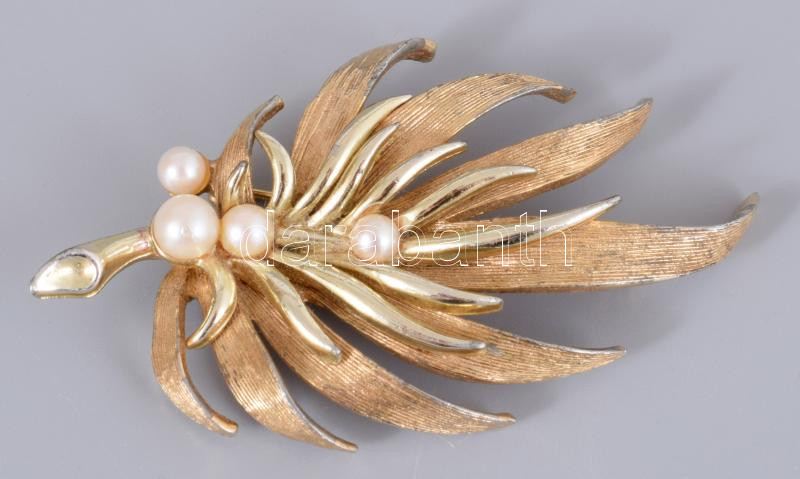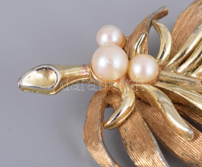 Leírás: Aranyszínű levél alakú bross, 4 darab tenyésztett gyönggyel, 6,5x4 cm