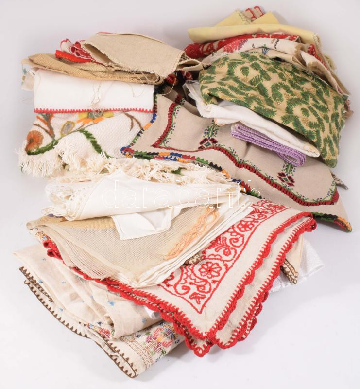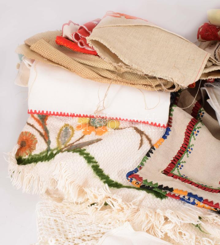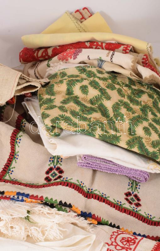 Leírás: Banános ládányi vegyes hímzett textil tétel, közte beregi makkos hímzés, keresztszemes szalvéták, erdélyi hímzések, kalocsai minták, stb., antik darabokkal.