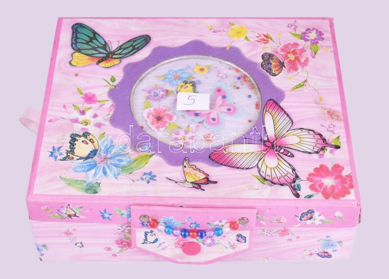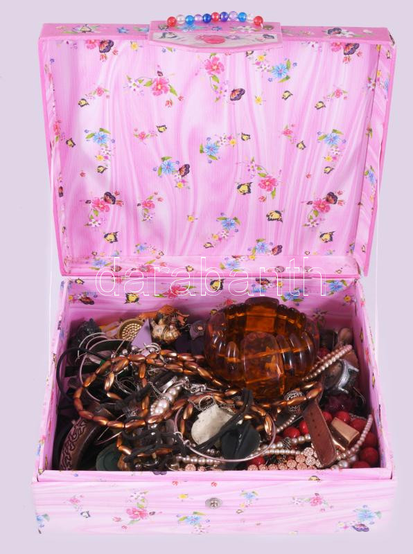 Leírás: Díszdoboznyi bizsu és óra, érdekes darabokkal, 19x21 cm