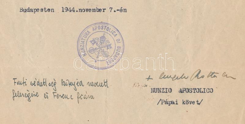 1944 A Budapesti Apostoli Nunciatúra által kibocsátott munkaszolgálatos zsidó személynek szóló oltalomlevél, Angelo Rotta (1872-1965) apostoli nuncius aláírásával / 1944 Safe-conduct issued by the Papal Embassy of Budapest for a Hungarian Jewish woman, with the signature of Angelo Rotta (1872-1965) Papal legate in Budapest