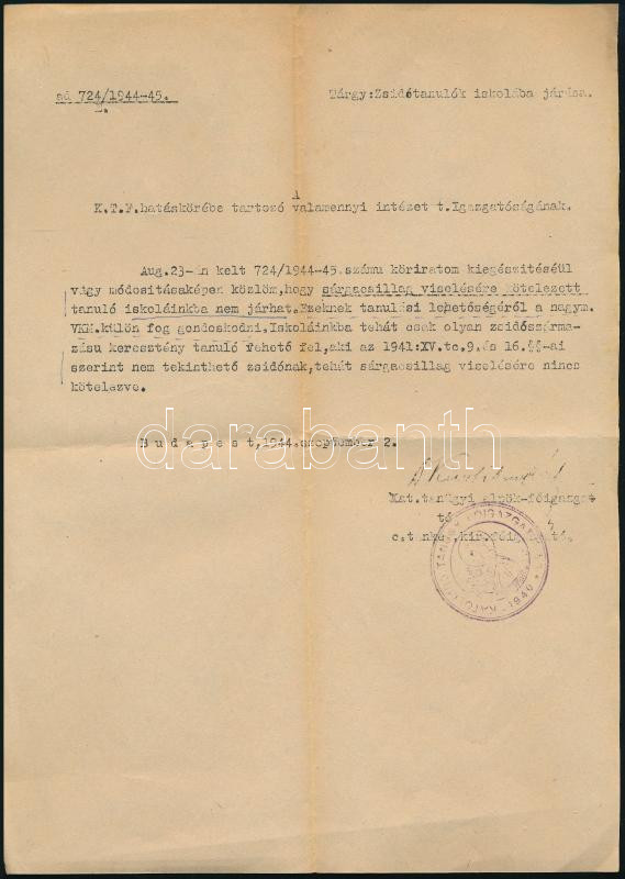 1944 Zsidó tanulók iskolába járásról szóló körlevél, 1944. szept. 2., ... https://www.darabanth.com/hu/517-Filatelia-kepeslap-numizmatika-mutargy-konyv-papirregiseg-ekszer-aukcio/522.0/Mutargy-papirregiseg-egyeb/Judaika~66/1944-Zsido-tanulok-iskolaba-jarasrol-szolo-korlevel-1944-szept-2-sargacsillag-viselesere~II3506067