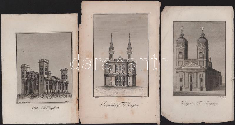 Leírás: 3 db templomokat ábrázoló metszet: Pécsi főtemplom, Szombathelyi főtemplom, Veszprémi főtemplom. Rézmetszet, papír, jelzettek a metszeten, változó állapotban, lapméret: 19x13 cm körül