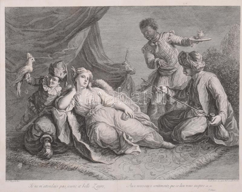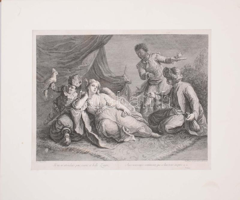 Leírás: Nicolaus Cavalli : Voltaire Zaire c, művének egyik jelenete. Rézmetszet, papír. Paszpartuban 41x31 cm