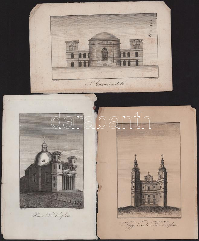 Leírás: Perlaszka Domokos (1801-1846) 3 db metszete: Váci főtemplom, Nagyváradi főtemplom, Gannai sírbolt. Rézmetszet, papír, változó állapotban, kisebb lapszéli sérülésekkel, részben foltos, lapméret: 21x13,5 cm körül
