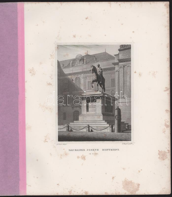 Leírás: cca 1860-1870 B. Schwarz - E.Wagner: A József császár-emlékmű Bécsben (Das Kaiser Joseph Monument in Wien). Acélmetszet, papír, foltos, lapméret: 32x25 cm