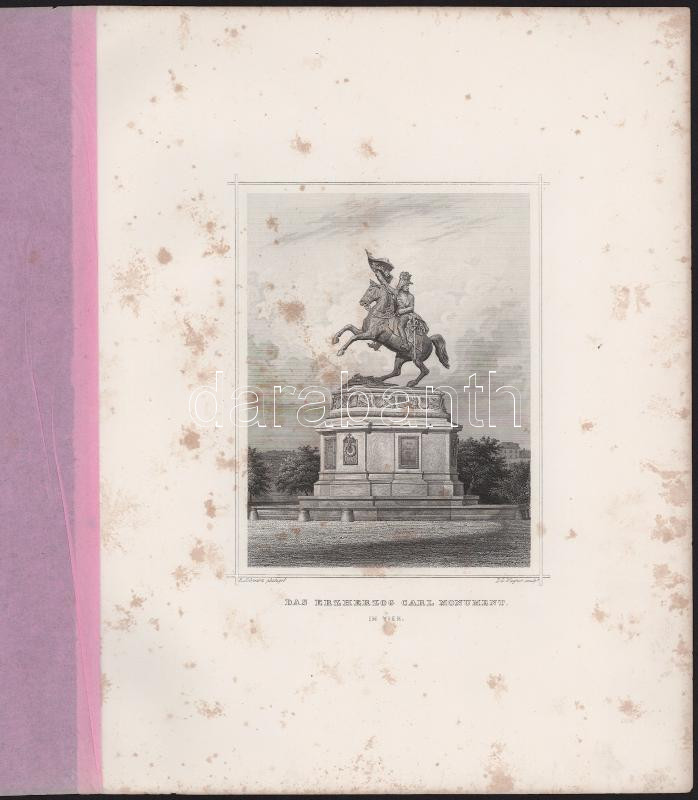 Leírás: cca 1860-1870 B. Schwarz - E.Wagner: Károly főherceg lovasszobra Bécsben (Das Erzherzog Carl Monument in Wien). Acélmetszet, papír, foltos, lapméret: 32x25 cm