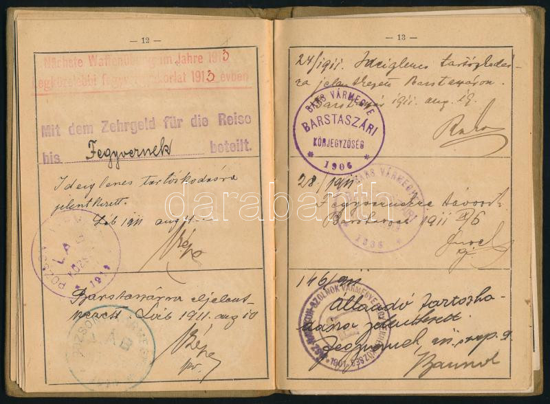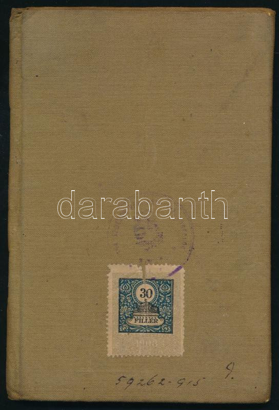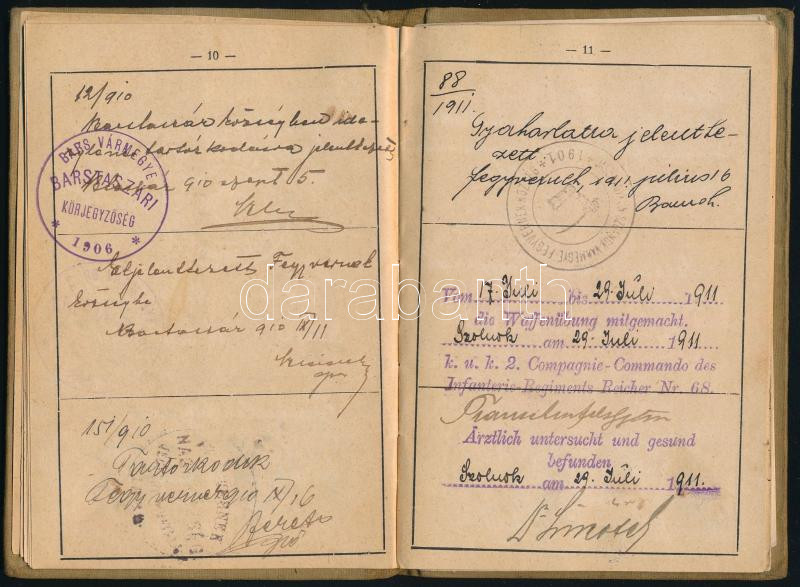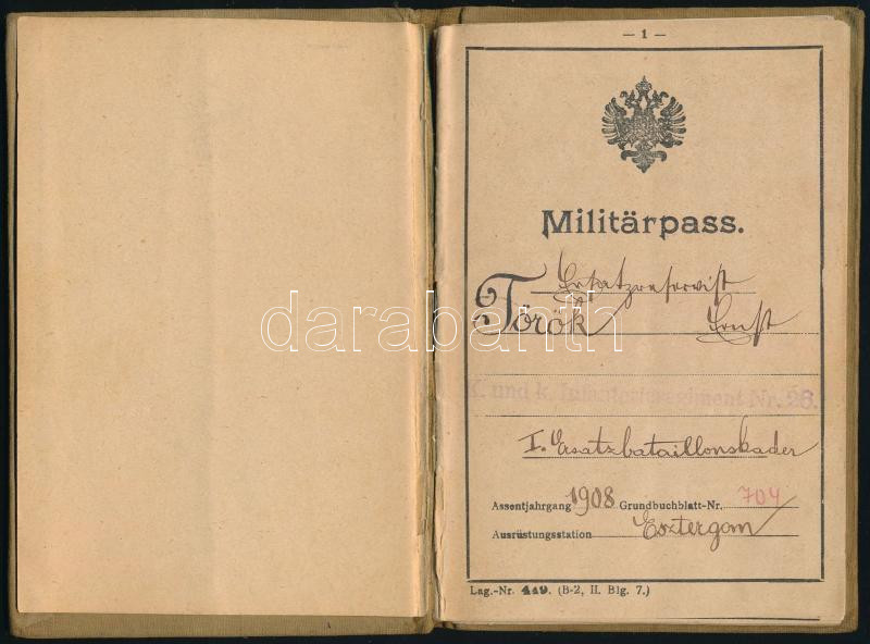 Leírás: 1910 Esztergom, a cs. és kir. 26. gyalogezred I. pótzászlóalja (K. u. k. Infanterieregiment Nr. 26. I. Ersatzbataillonskader) által kiállított katonai igazolvány (Militärpass), több oldalnyi bejegyzéssel, 30f okmánybélyeggel