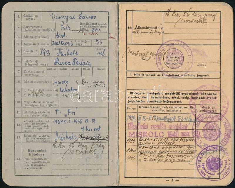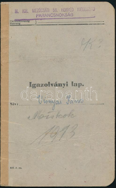 1939 Mezőcsát, katonai igazolványi lap, M. kir. mezőcsáti 56. honvéd k... https://www.darabanth.com/hu/517-Filatelia-kepeslap-numizmatika-mutargy-konyv-papirregiseg-ekszer-aukcio/522.0/Mutargy-papirregiseg-egyeb/Militaria~78/1939-Mezocsat-katonai-igazolvanyi-lap-M-kir-mezocsati-56-honved-kiegeszito-parancsnoksag-~II3508547