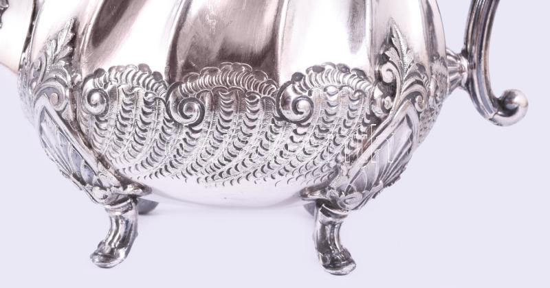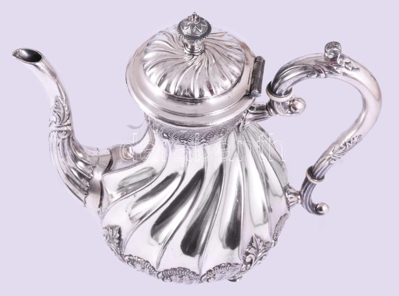 Leírás: Dekoratív jelzett ezüstözött teás kanna, minimális kopással, m: 24 cm
