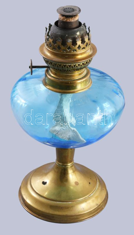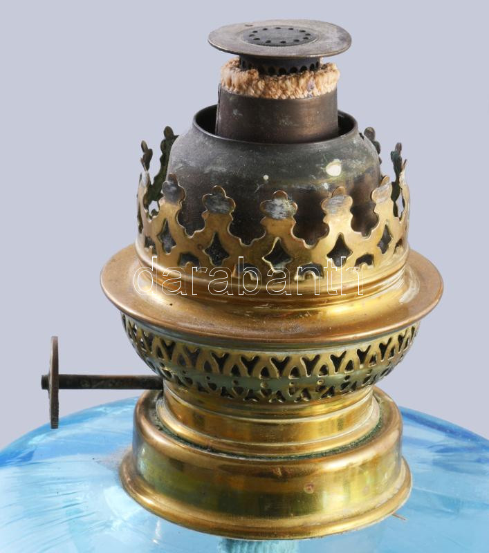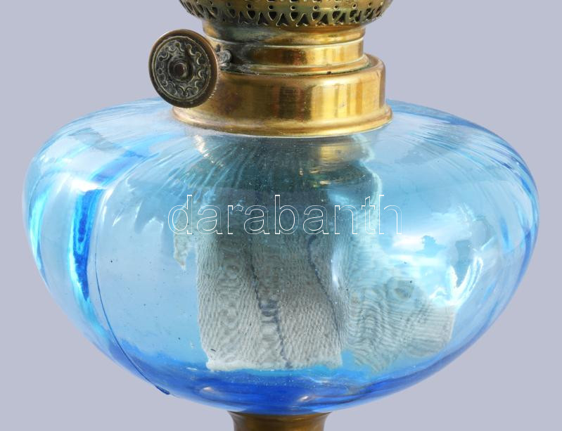 Leírás: Kéküveg tartályos antik petróleum lámpa, m: 27 cm