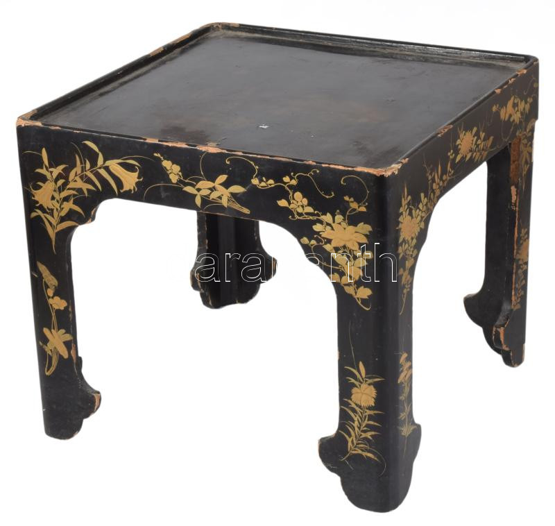 Leírás: Kínai lakkozott kis asztal. Kína, 19. sz utolsó harmada, javítással, sérüléssel 29x29x25 cm