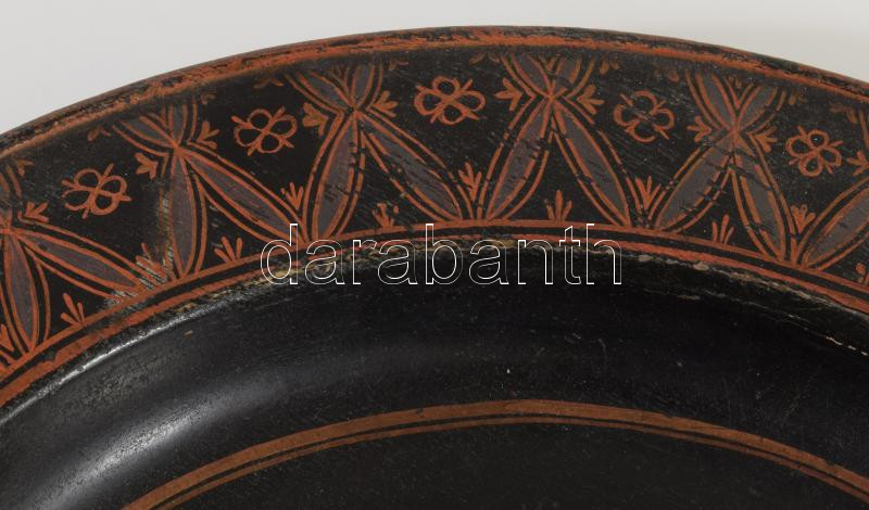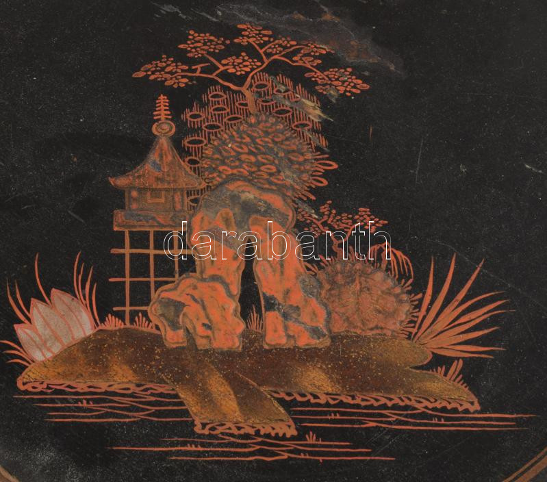 Leírás: cca 1860 Japán lakkozott dísztál betéttel. Japán, Edo-kor, javítással, felületi sérüléssel, d: 34 cm