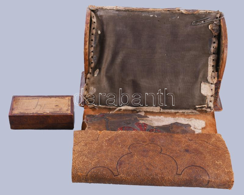 Leírás: cca 1880 Francia bőrbevonatos levéltartó és bélyegtartó. Levéltartó bőr része sérült 26x16 cm, bélyegtartó h: 11 cm