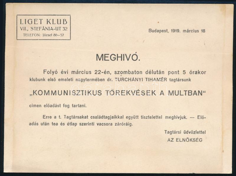 Leírás: 1919 Bp., a Liget Klub meghívója Turchányi Tihamér ,,Kommunisztikus törekvések a múltban" c. előadására