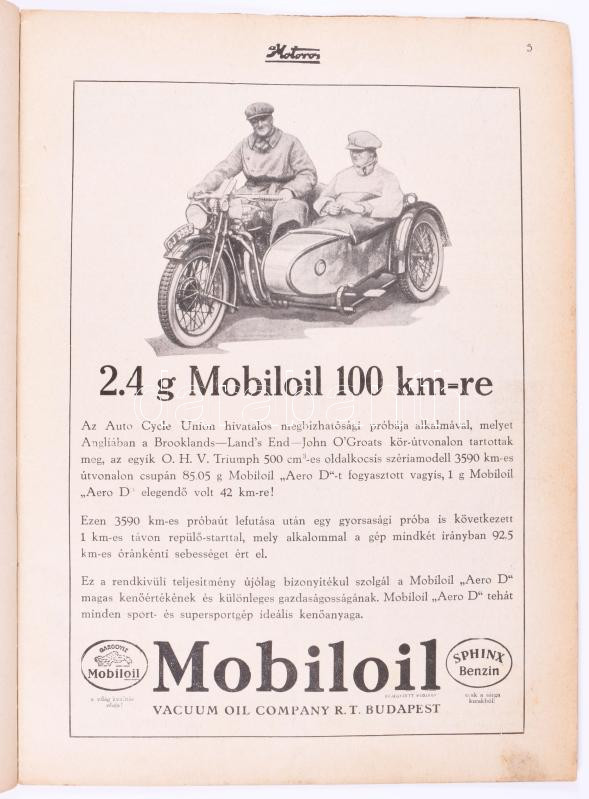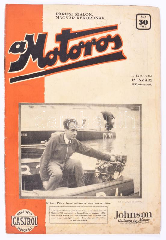 1930 A Motoros. A Magyar Motorosok Érdekeit Szolgáló Független Képes Szaklap. 1930. október 25. II. évf. 15. sz. Felelős szerk.: Kramer Jenő. Bp., 1930, Motoros Lapkiadó Vállalat, 20 p. Gazdag és izgalmas fekete-fehér képanyaggal illusztrált. Érdekes korabeli hírekkel, és írásokkal. Kiadói papírkötésben, foltos borítóval, a hátsó borítón hiánnyal, sérüléssel.