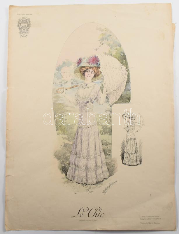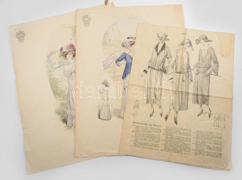 Leírás: 3 db női divatillusztráció, az egyik 4 oldalas, változó állapotban, részben foltos, 37x27,5 cm és 42x31 cm