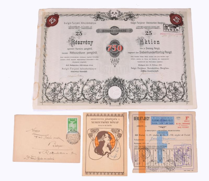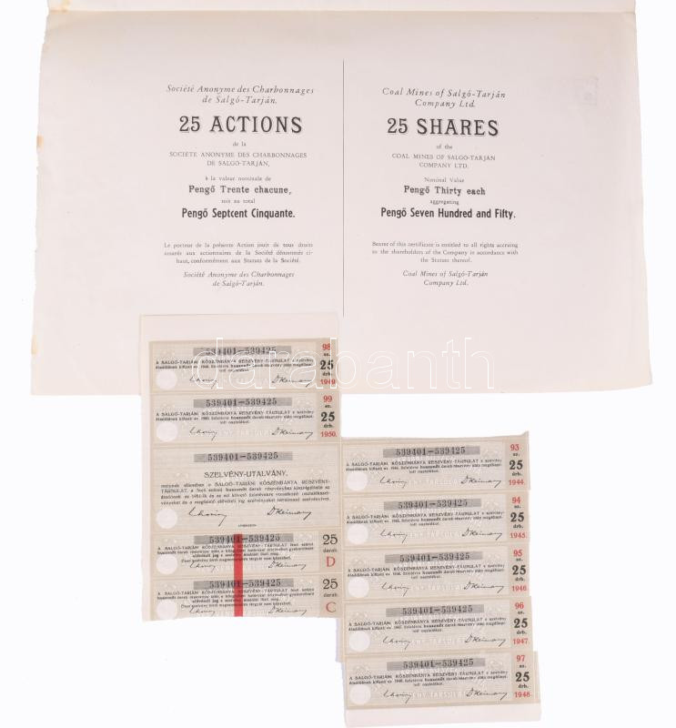 Leírás: Budapest 1935. "Salgó-Tarjáni Kőszénbánya Részvény-Társulat" huszonöt részvénye egyben, összesen 750P-ről, magyar-német kétnyelvű részvény, szelvényekkel, szárazpecséttel és bélyegzésekkel T:EF + egy két kisnyomtatvány