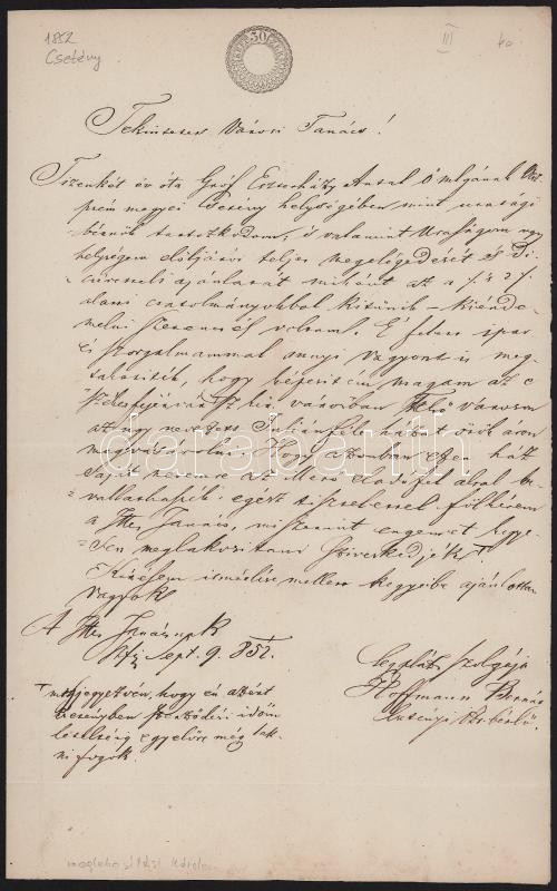 Leírás: 1852 Hoffmann Bernát csetényi urasági bérlő lakosítási kérelme Székesfehérvár sz. kir. város tanácsához, 30kr szignettával