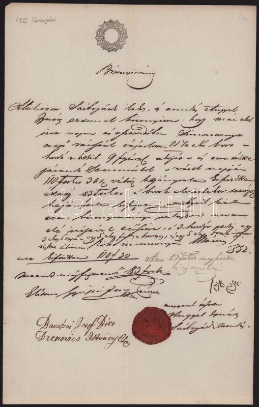 Leírás: 1852 Simontornya, sárbogárdi lakos részére kiállított bizonyítvány 15kr szignettával, "SIMONTORNYA MEZŐ VÁROS PETSÉTJE 1851" viaszpecséttel