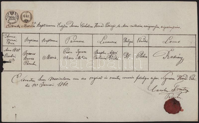 Leírás: 1860 Hernádpetri, keresztlevél 30kr + 6kr okmánybélyeggel, viaszpecséttel, kisebb lapszéli sérüléssel