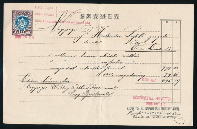 1908 Magyar Fém- és Lámpaárugyár Rt. díjjegyes számla https://www.darabanth.com/hu/517-Filatelia-kepeslap-numizmatika-mutargy-konyv-papirregiseg-ekszer-aukcio/522.0/Mutargy-papirregiseg-egyeb/Okmanyok~58/1908-Magyar-Fem-es-Lampaarugyar-Rt-dijjegyes-szamla~II3507721