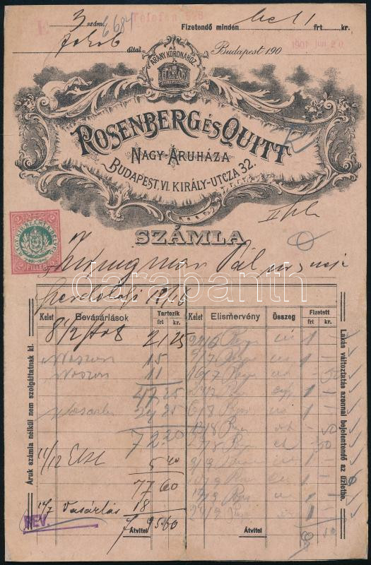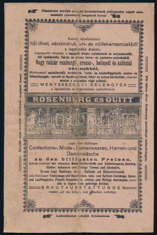 Leírás: 1901 Rosenebrg és Quit Nagy-Áruháza díszes fejléces számlája, az utolsó oldalon az üzlet kirakatának részletével (Budapest, VI. Király-utcza 32.), 2 sztl. lev.