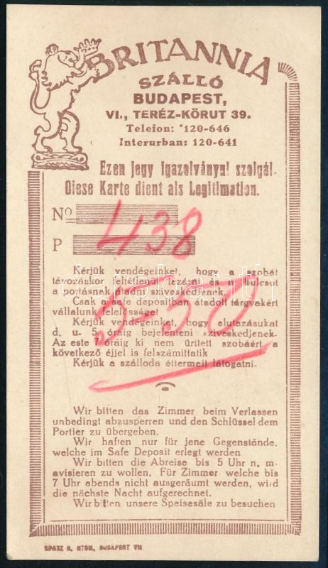 Leírás: cca 1930-1940 Britannia Szálló (Bp., VI., Teréz körút 39.) szobajegy