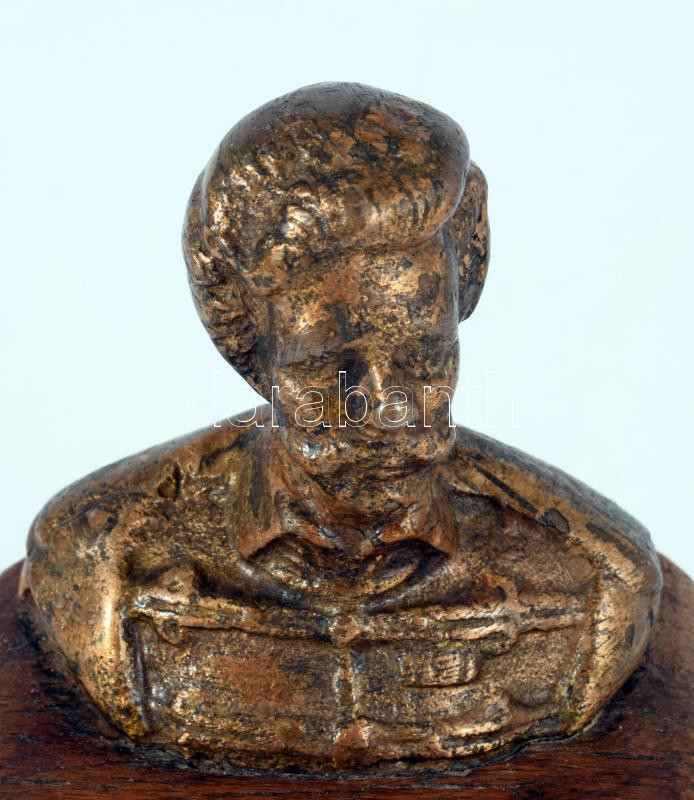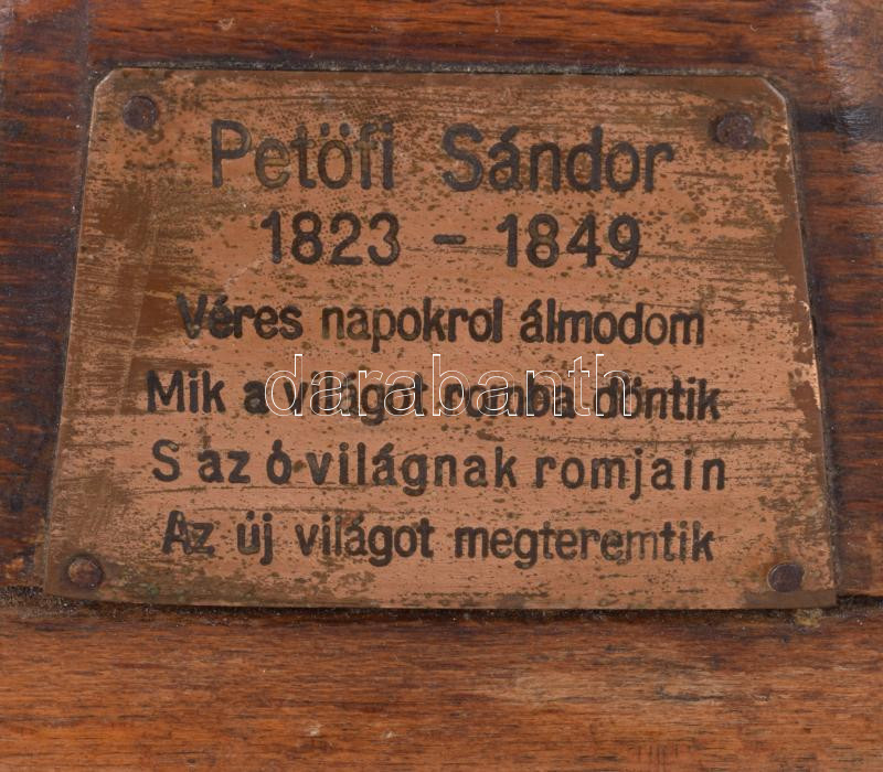 Petőfi Sándor büszt. Bronz vagy bronzírozott fém, fa talapzaton, 20. sz. eleje, fém táblán versének részletével, m: 14 cm