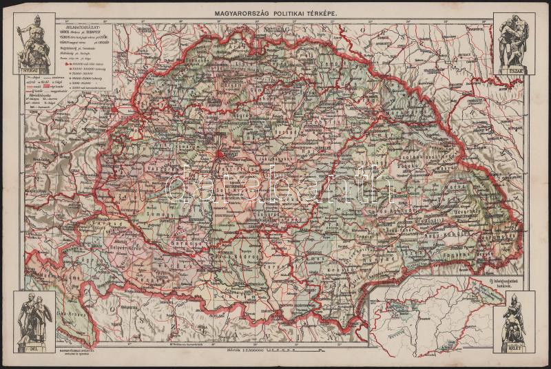 Színes politikai térképünk a történelmi Magyarország határain belül az 1938. november 2-i első bécsi döntést követő új, a Felvidék magyar lakta területeivel bővült, Komáromot, Losoncot, Rimaszombatot és Rozsnyót, Kassát, Ungvárt és Munkácsot is magában foglaló országhatárokat ábrázolja. Évszámadat nélkül kiadott lapunk kiadási idejének megállapításához fontos adat, hogy dokumentumunk északi szomszédunkként Csehszlovákiát nevezi meg, így az még az 1939 márciusa előtti időre utal, a Csehország német megszállása, az önálló Szlovákia kikiáltása és magyar részről a kárpátaljai bevonulás előtti időpillanatra. Domborzati, vízrajzi, közlekedési, településhálózati és közigazgatási részletekben bővelkedő térképünk jobb alsó sarkában a közigazgatásilag egyelőre egyesített vármegyéket feltüntető melléktérkép, négy sarkában a négy égtájat feltüntető budapesti irredenta szobrok grafikájával (Észak, Kelet, Dél, Nyugat). jó állapotban