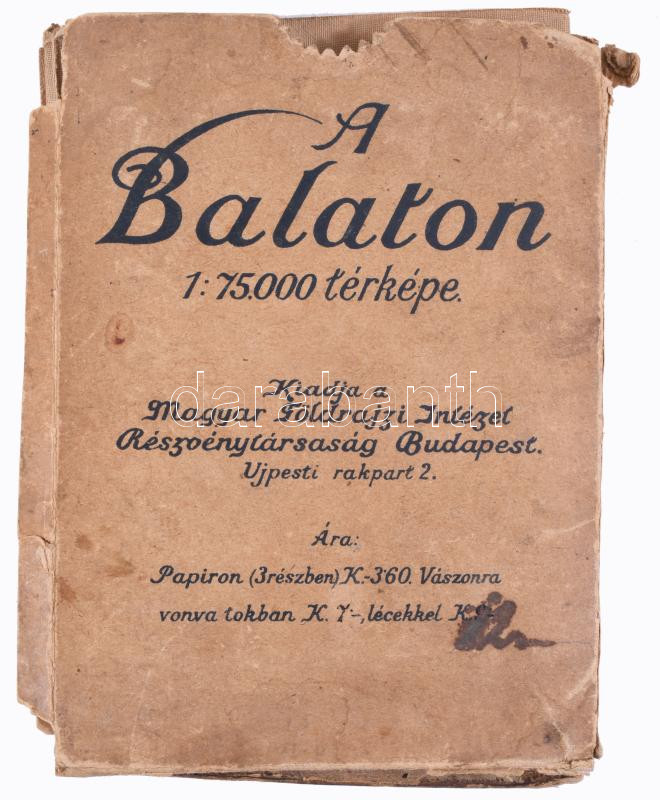 Leírás: cca 1920 A Balaton 1:75:000 térképe, 3 részes: I.: Keszthely és Badacsony, II.: Fonyód és Szárszó, II.: Szárszó és Balatonkenese. Bp., Magyar Földrajzi Intézet Rt., vászonra kasírozva, foltos vászonnal, sérült kiadói kartontokban, 51x36 cm, 52x37 cm, 60x43 cm
