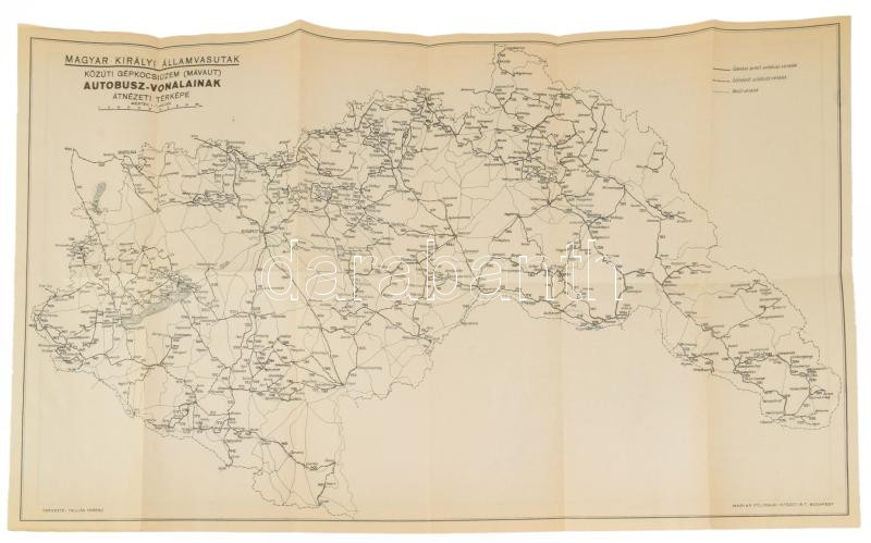 cca 1941 Magyar Királyi Államvasutak közúti gépkocsiüzem (MÁVAUT) autóbusz-vonalainak és a M. Kir. Államvasutak hálózatának átnézeti térképe, kétoldalas térkép (rajta a visszatért felvidéki, kárpátaljai, erdélyi területekkel), tervezte: Tallián Ferenc, 1 : 400.000, Bp., Magyar Földrajzi Intézet Rt., 33x59 cm