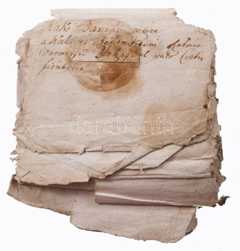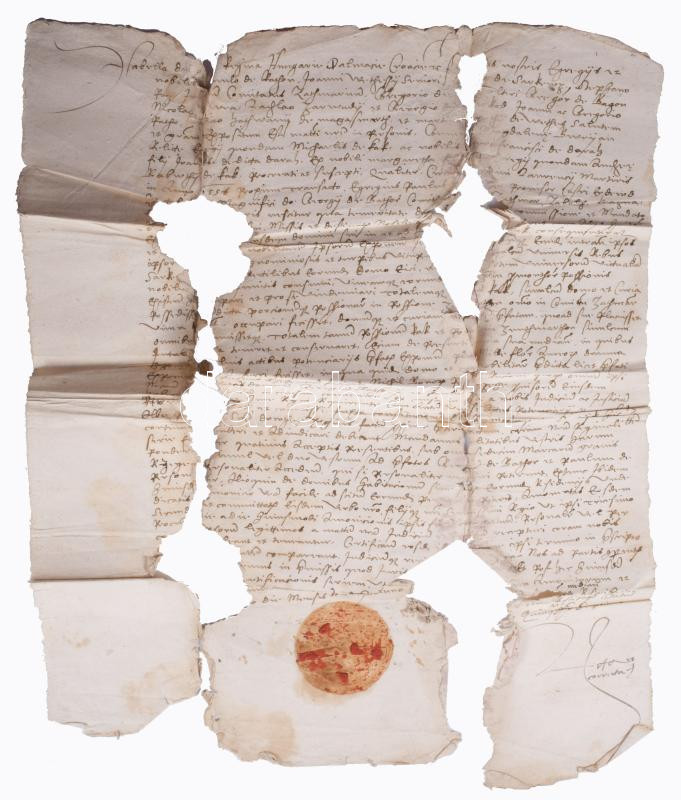 1551. Original charter of Queen Isabella Jagiellon to the widow of Michael Kak, Magdolna Burián, and Ferenc Darai regarding the Kaki and Szentmárton properties in Satu Mare County. 42x31 cm Heavily damaged A large, original royal charter from one of the most important female rulers of early modern Hungarian law. Isabella Jagiellon (1519?1559), widow of King John of Szapolyai, exercised royal power as guardian of her son, John Sigismund, during this period, so the charters she issued are important documents of the operation of the Hungarian royal chancellery in Transylvania.