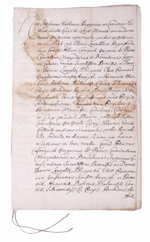 1671. May. 24. Lelesz (Leles, Slovakia) István Waskovics, provost of Lelesz, report (relatio) to Lipót I., and Ádám Forgách of Gyimes. The document is a multiple-part document, so the warrant sent to the Lelesz convent can also be read in it. Based on the warrant, the men of the convent and the royal envoy had to give testimony in the case of Márton Kende, to see if he was a part of the Wesselényi conspiracy. This is followed by the testimony record written in Hungarian. Original, sealed document, the seal has been removed. 16 written pages