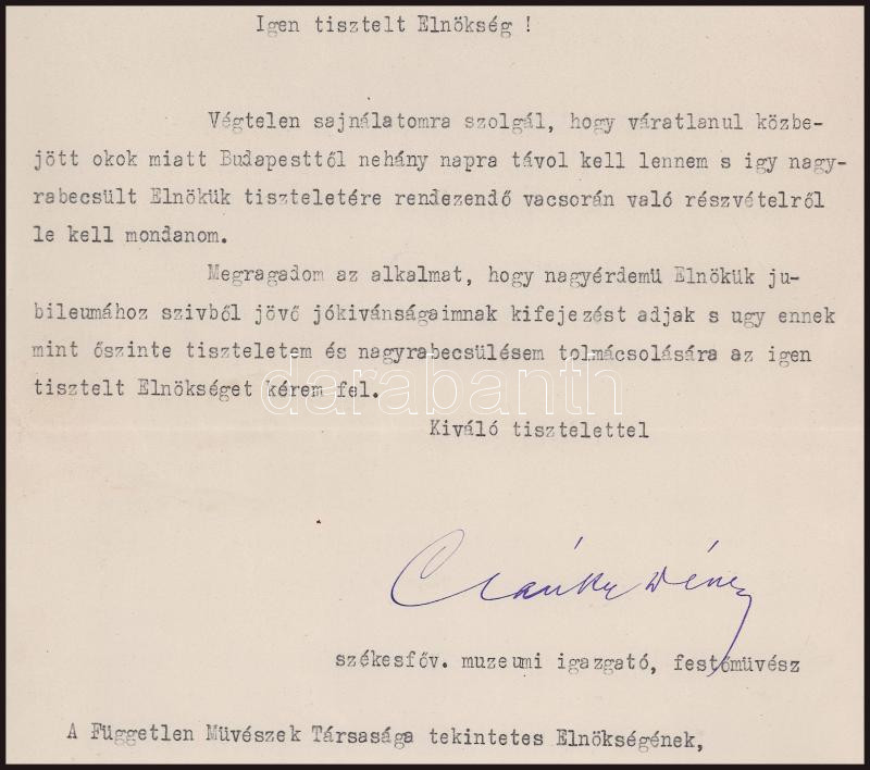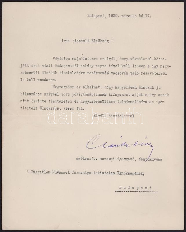 1930 Csánky Dénes (1885-1972) festőművész, a Szépművészeti Múzeum igazgatója autográf aláírással ellátott levele a Független Festőművészek Társaságának