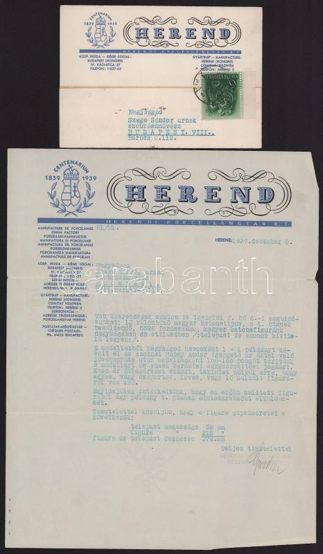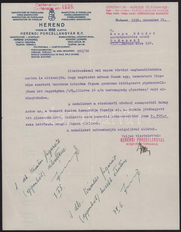 1936-1938 Szege Sándor (1883-1945) szobrász, éremművész hagyatékából 3 db neki címzett fejléces levél a Herendi Porcelángyártól, a cég számára tervezett figurákkal kapcsolatosan