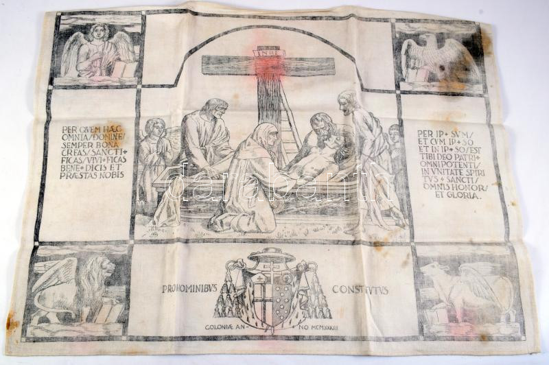 1942 Corporale (vagy korporálé) kölni érsekí címerrel. Belevarrt ereklyével. 50x38 cm Josef Frings (1887-1978) érsek címerével. A katolikusok nácizmussal szembeni ellenállásának jelentős alakjának tartják, 1946-ban XII. Pius pápa bíborossá emelte