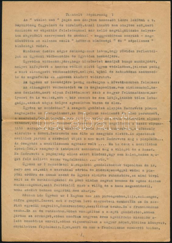 1946 Zadravecz István (1884-1965) horvát származású ferences szerzetes, tábori püspök népbíróság előtt mondott védőbeszéde, 1946. ápr. 10., gépelt, foltos, hajtott, hajtás mentén szakadásokkal, 4 p. + Páter Zadravecz titkos naplója. Magyar Történelmi Társulat. Bp., 1967, Kossuth. Kiadói egészvászon-kötés.