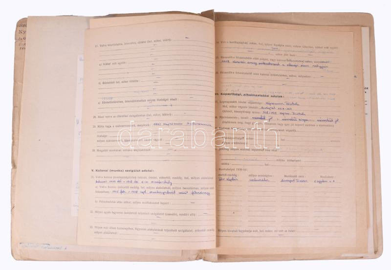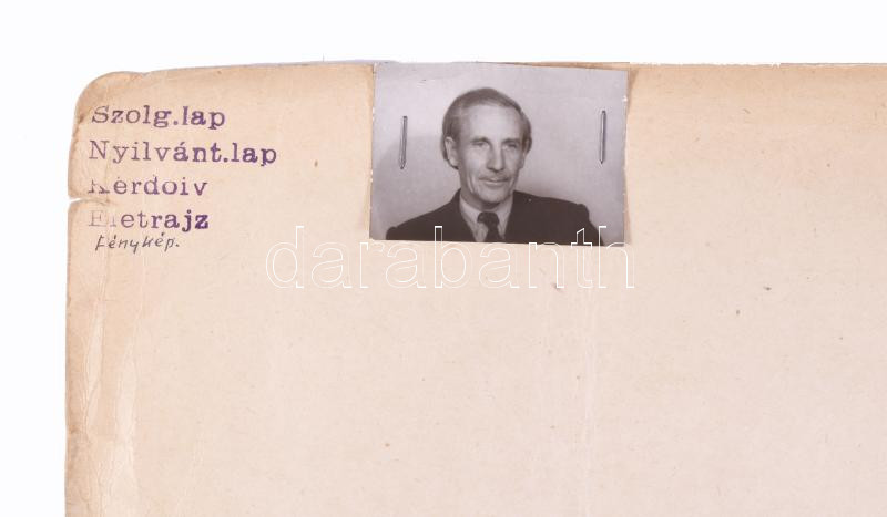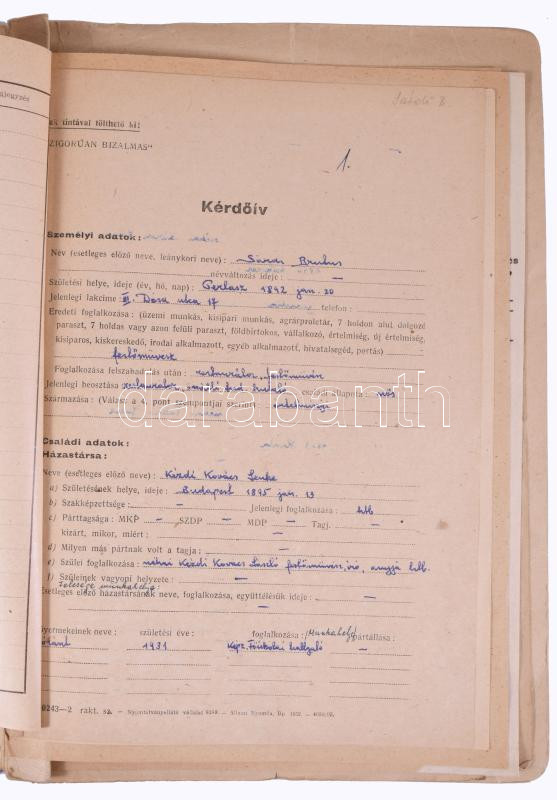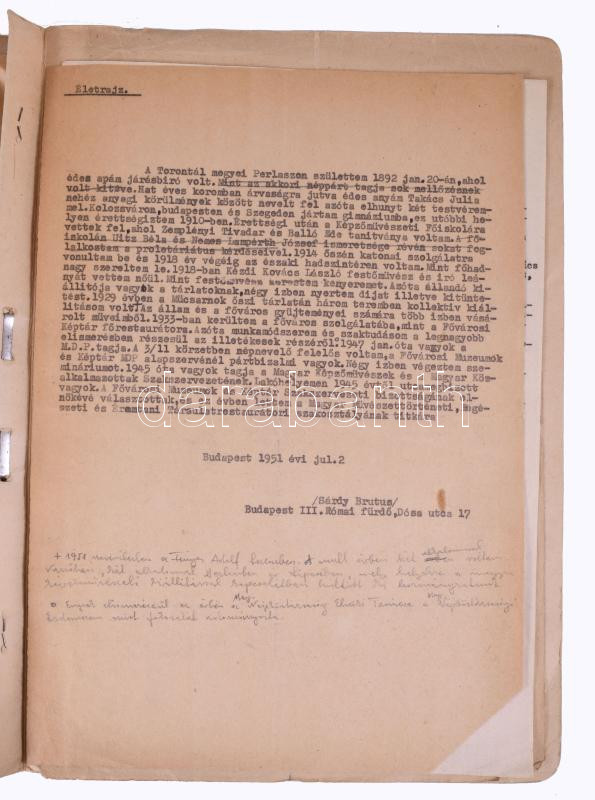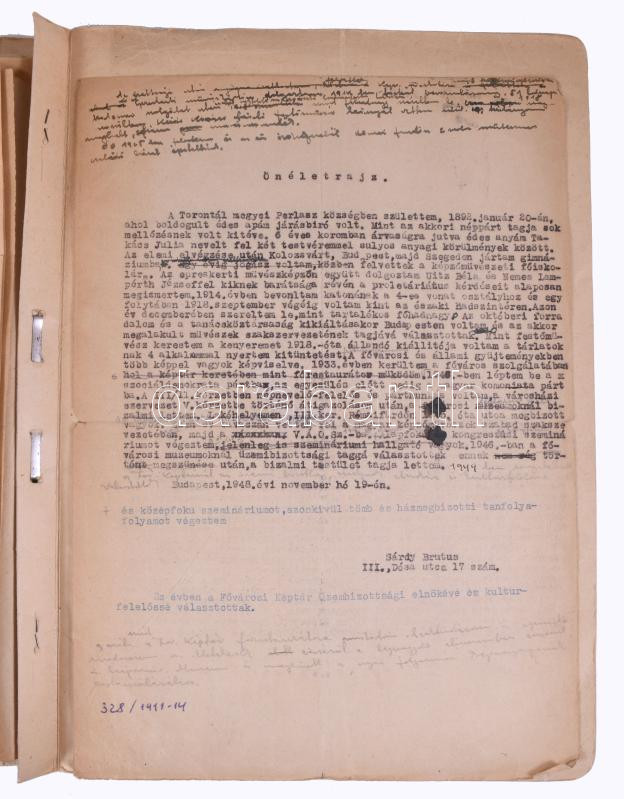 1952 Sárdy Brutus (1892-1970) festőművész és restaurátor szakember bizalmas személyi nyilvántartó lapja. Autográf kitöltött kérdőívek, aláírt önéletrajzok, stb.