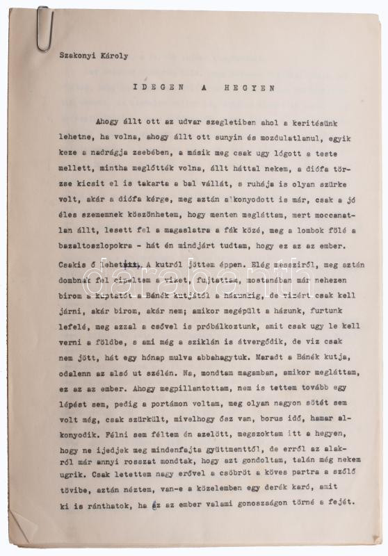 Szakonyi Károly (1931): Idegen a hegyen c. novellájának gépirata autográf javításokkal. 20p.