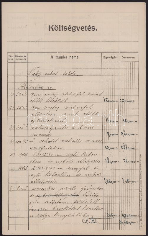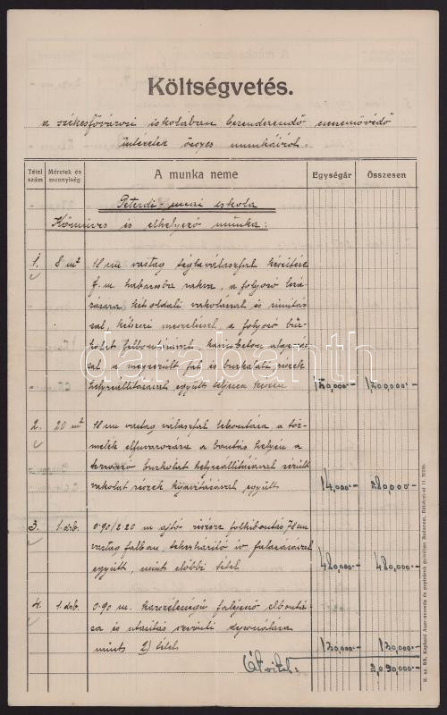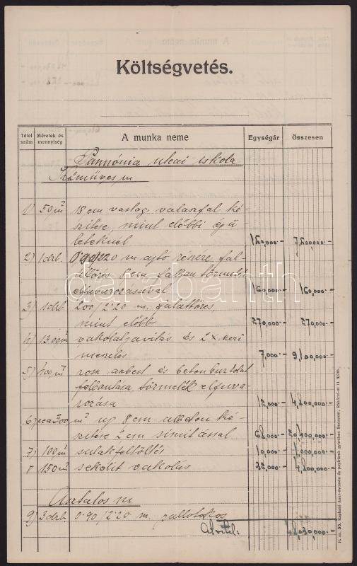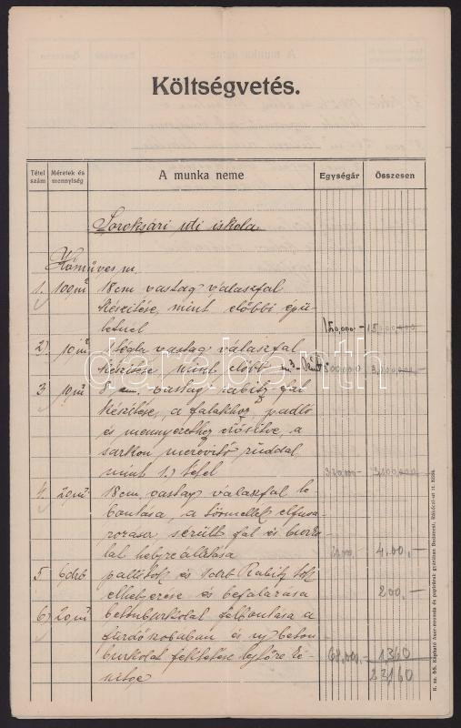 ca 1910 IX. Soroksári úti iskola átépítési költségvetés, kézzel írott 42 p.