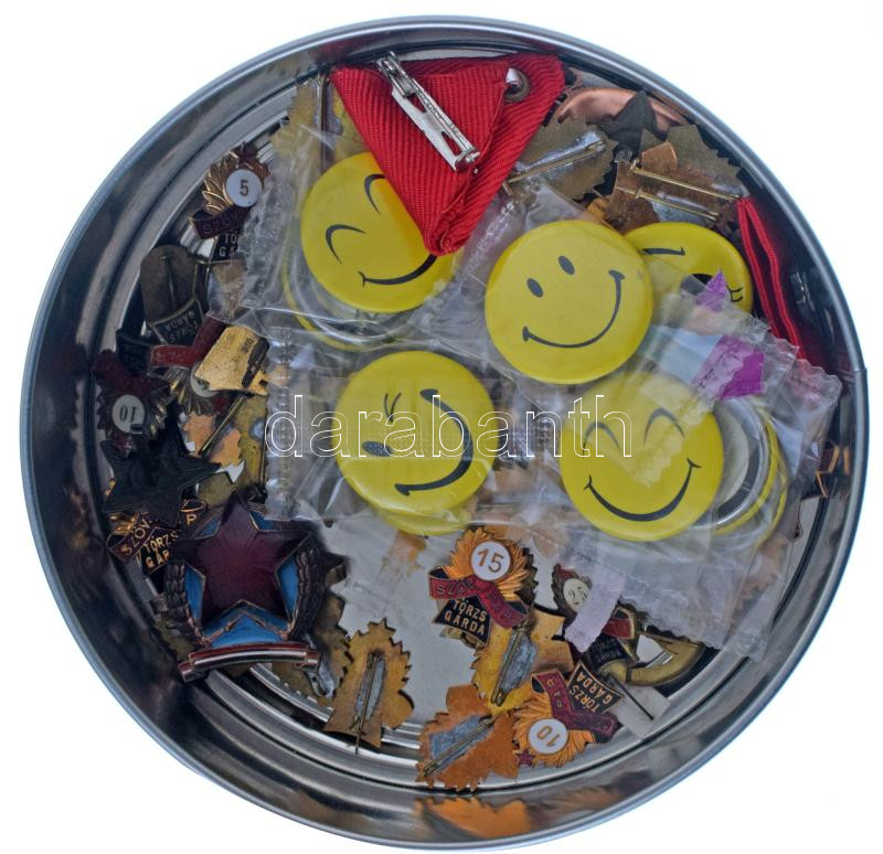 Kis fémdoboznyi, főleg szocialista jelvényből álló tétel, közte 1985. "A Munka Érdemrend arany fokozata" zománcozott bronz kitüntetés eredeti mellszalagon, miniatűrrel szalagsávon + zománcozott iskolajelvény + cserkész miniatűr bronz jelvény tű nélkül T:vegyes